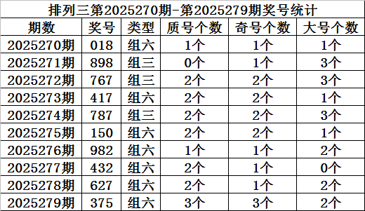 上期回顾:排列三第2025279期开奖:375,质合比为3:0,奇偶比为2:1,大小比为3:0。