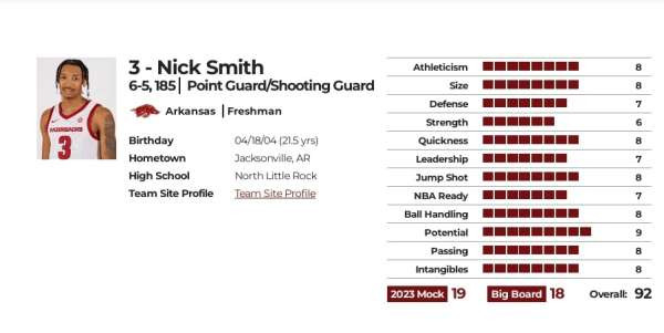小史密斯在阿肯色大学会有绝对核心地位,前途一片光明,但天有不测风云,他在赛季初遭遇严重膝伤,缺席了半个赛季比赛,伤愈复出后表现也非常一般,场均出场26分钟得到12.5分、1.6篮板、1.7次助攻数据,三分球命中率仅有33.8%,而且在关注度最高的疯狂三月三场比赛中,他的表现是一塌糊涂,第一场比赛10投2中得6分,第二场比赛的4投0中挂蛋,第三场球队以大比分输给康涅狄格大学,他也仅得11分,这一个赛季的糟糕表现让他的选秀声望大受影响。