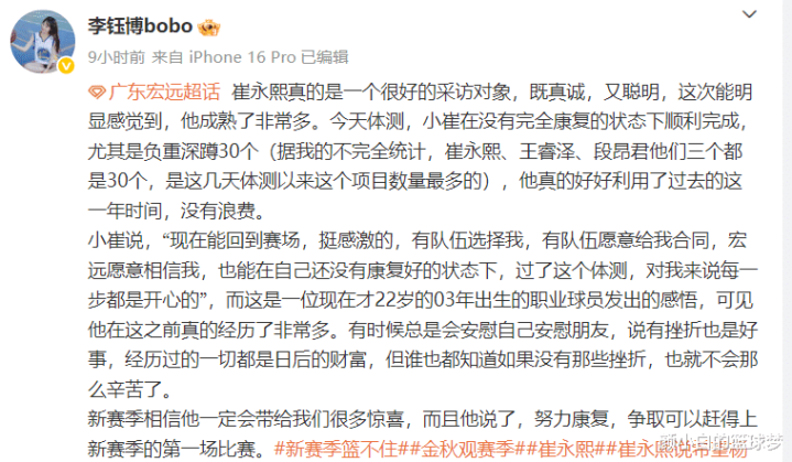 崔永熙在2024年12月12日遭遇了左膝前交叉韧带撕裂大伤,随后他被篮网队裁掉,重返CBA后被广州交易至广东,还剩16天他就已经足足1年时间没有打过正式比赛,一天之前他刚刚完成了CBA的体测。