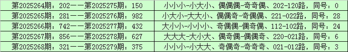 则,排列三第2025269期奖号:875,与排列三第2025280期奖号可能有相同的号码。且排列三第2025280期奖号大小比、奇偶比和012路比可以参考第2025269期奖号形态:大大大、偶奇奇和212路。