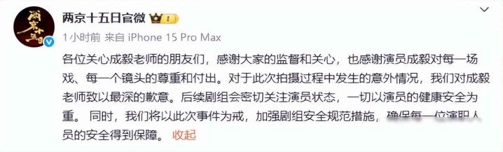 视频传开后,微博上关于影视安全的话题一天之内阅读量冲到一亿两千万,有人翻出成毅以前拍摄《莲花楼》和《沉香如屑》时的片段,发现他好几次直接摔在地上,没有用保护设备,大家开始讨论这种真实摔倒和打斗,到底是为了艺术效果,还是因为现场缺乏规范管理。