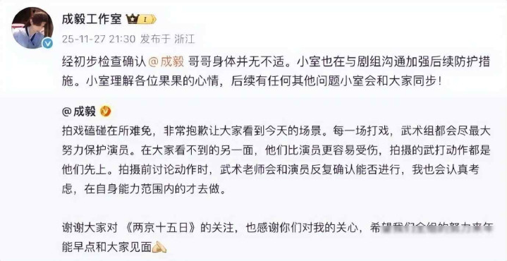 那天下午,成毅在拍《两京十五日》的屋顶戏份,他吊着威亚跑动时绳子突然松脱,整个人直接摔到地上,胸口先撞上硬物,头也跟着磕在地面,现场没有铺设软垫,旁边的人看见他蜷起身子滚了几下,疼得站不起来,只能低声呻吟。