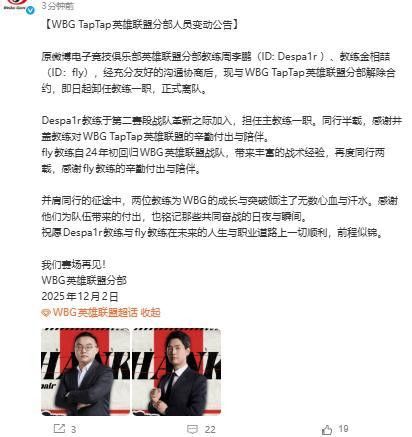 [#WBG官宣教练fly离队#]#WBG官宣Despa1r离队#WBGTapTap英雄联盟分部人员变动公告:原微博电子竞技俱乐部英雄联盟分部教练周李鹏(ID:Despa1r)、教练金相喆(ID:fly),经充分友好的沟通协商后,现与WBGTapTap英雄联盟分部解除合约,即日起卸任教练一职,正式离队。