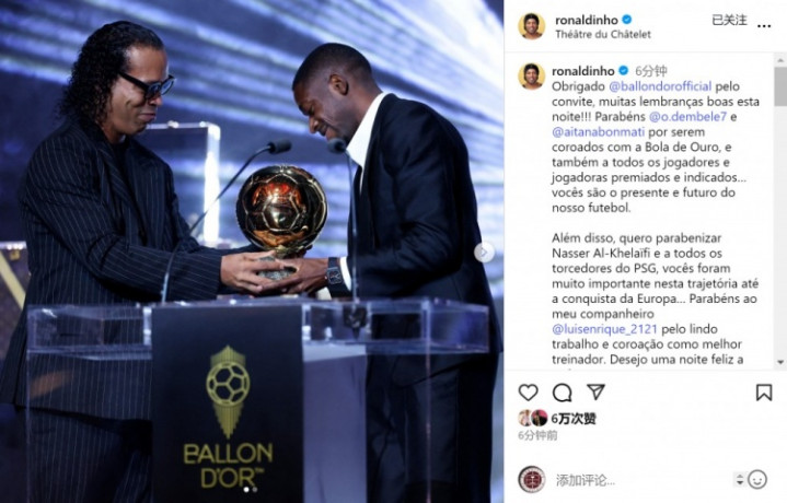 罗纳尔迪尼奥社媒晒出颁奖照片,并写道:“感谢金球奖的邀请,今晚留下了许多美好的回忆!恭喜登贝莱和邦马蒂荣获金球奖,也祝贺所有获奖和入围的球员们……你们是足球的现在和未来。”