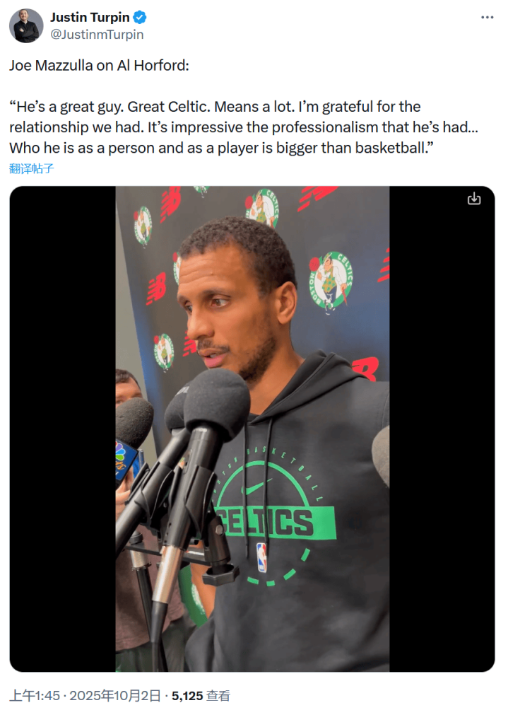 凯尔特人队主帅马祖拉也谈到了离队的霍福德,他说道:“霍福德是个很棒的人,一个很出色的凯尔特人。他对我们意义非凡,我很感激我们曾经共事过的经历。他的职业精神令人印象深刻,他作为一个人和球员的价值,远大于篮球本身。”